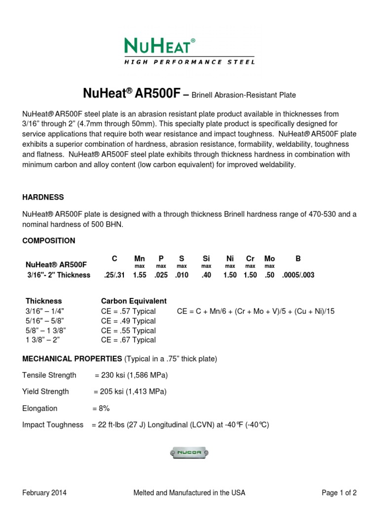 Ar500 steel data sheet. Tensalloy ar500 wear resistant steel plate astm a6 rectangle ar500 1875 x 16 x 16 black. It is a high carbon steel alloy that provides greater impact and sliding abrasion resistance by comparison. Abrasion resistant steel grade that offers more surface hardness than ar400 without compromising ductility and formability. Abrasion resistant steel plate grade used in high wear applications such as in mining equipment and concrete handling.